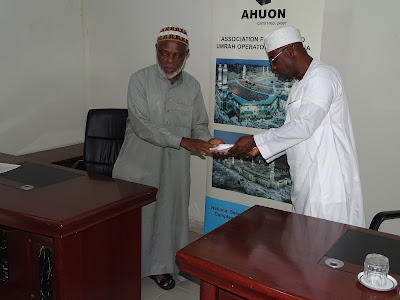 Alhaji Mohammed Lawal Adam, Vice President of AHUON, Abuja Zone, Salihu Abdullahi, Deputy President, Umrah, Abdul Malik Hassan, Financial Secretary, Ibrahim Balogun of Comerel Travels and yours truly, among other members received the team.